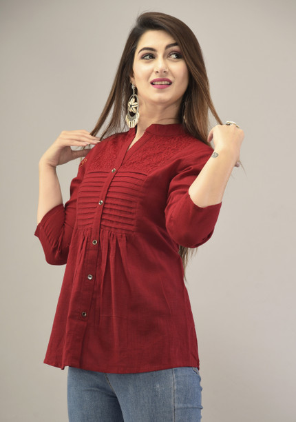 Women Regular Fit Embroidered Mandarin Collar Casual Sh...