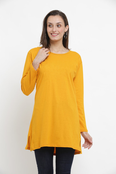 Women Solid Round Neck Cotton Blend Yellow T-Shirt