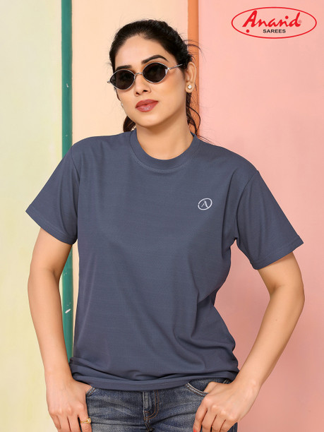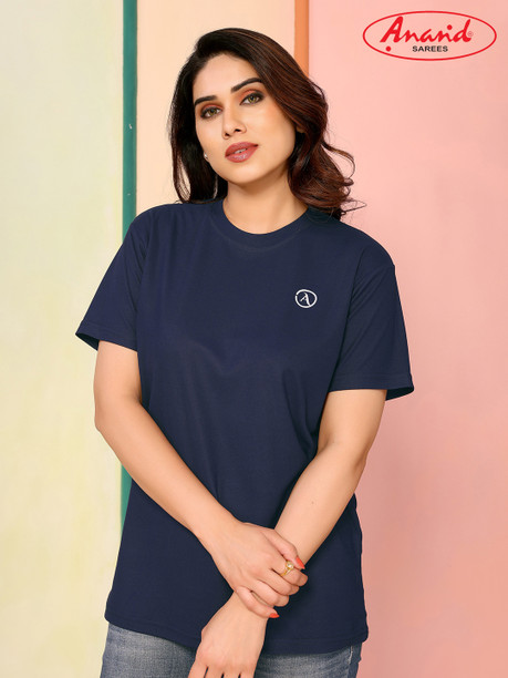Women Solid Round Neck Polyester Dark Blue T-Shirt